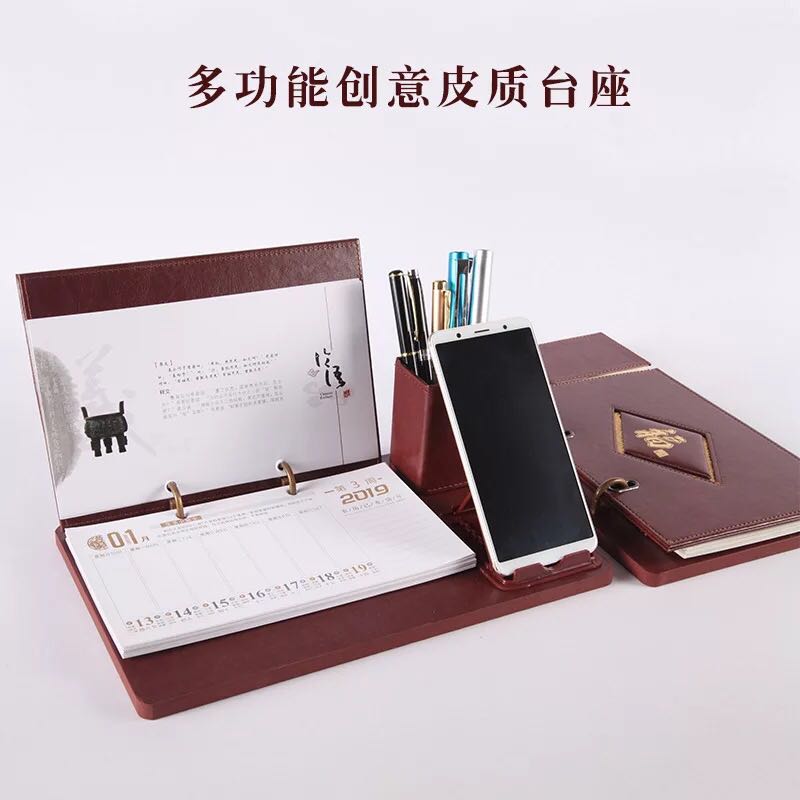 定做2019台历仿木质高档多功能皮质带笔筒周历记事本台座logo定制